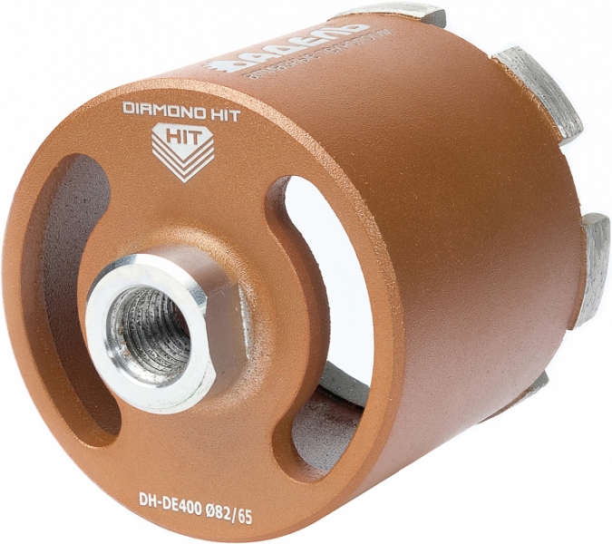 НОУ-ХАУ в сухом алмазном сверлении железобетона – новейшая передовая технология Diamond Hit !!! Алмазная коронка с пылеудалением для сухого сверления подрозетников с микроударом Адель Diamond Hit DH-DE400 82/65 мм (Adel Даймонд Хит ДХ-ДЕ400 82/65 мм) предназначена для сухого алмазного бурения бетона, железобетона с любой степенью армирования, кирпича, для монтажа подрозетников с использованием дрелей алмазного бурения с функцией микроудара.