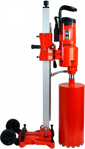 Алмазная сверлильная машина Diam ML-250/2A (Диам МЛ-250/2А) – мощная двухскоростная установка алмазного бурения с наклонной стойкой для сверления отверстий в бетоне и железобетоне Ø 20 – 220 мм, кирпичной кладке и других строительных материалах Ø 20 – 250 мм под углом до 45° в строительстве, при электромонтажных работах, прокладке сантехнических и вентиляционных труб, отбора проб грунта, высверливании проемов в стенах, а также для частного ремонта.