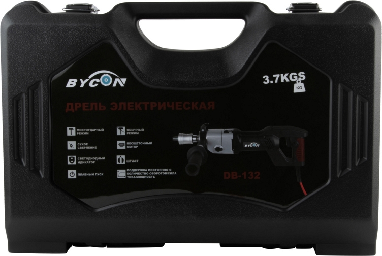 Бесщеточная дрель для сухого алмазного сверления с микроударом Bycon DB-132 (Байкон ДБ-132) – алмазная дрель с микроударом для сухого алмазного бурения отверстий Ø до 102 мм в бетоне, железобетоне, "легком" бетоне, шлакобетоне, кирпиче и других особенно твердых материалах при высокой рабочей скорости; как с использованием станины, так и "с рук"; для профессионального использования. Отличный вариант как для монтажников кондиционеров, так и для электриков. С дополнительными переходниками позволяет работать как алмазными коронками стандартной длины, так и коронками для подрозетников.