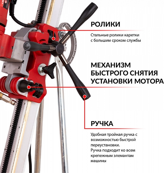 - Алюминиевая колонна со стальным основанием и электродвигатель, закрепленный на рабочей каретке с быстросъемным креплением "ласточкин хвост", которая перемещается по стойке с помощью стальной зубчатой рейки