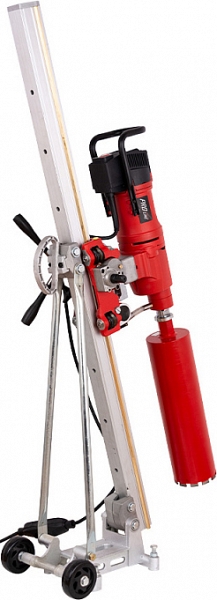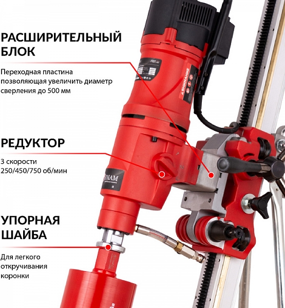 Установка алмазного бурения Diam PL-500/3ADC-1500 (Диам ПЛ-500/3АДЦ-1500) – мощная трехскоростная алмазная сверлильная машина с наклонной стойкой для сверления отверстий в бетоне и железобетоне, кирпичной кладке и других строительных материалах Ø 50 – 500 мм, под углом до 180°, в строительстве, при электромонтажных работах, прокладке сантехнических и вентиляционных труб, отбора проб грунта, высверливании проемов в стенах, а также для частного ремонта.